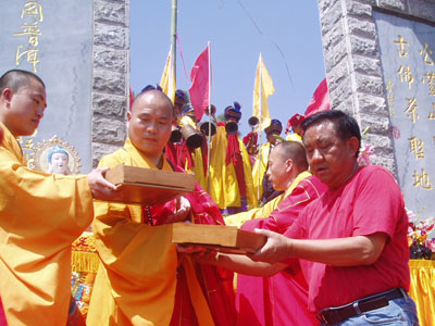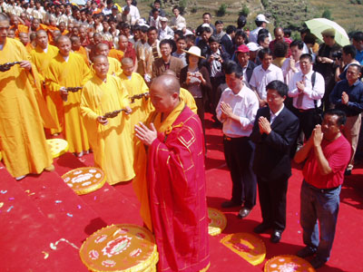 中午12点,在礼炮声中,少林寺方丈释永信大师,云南澜沧江集团董事长刘光汉先生共同揭开了石碑上的红布,宣告了“白莺山中国普洱佛茶圣地”成立。随后,在众多高僧的主持下,举行了隆重的祈福仪式。