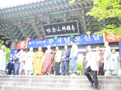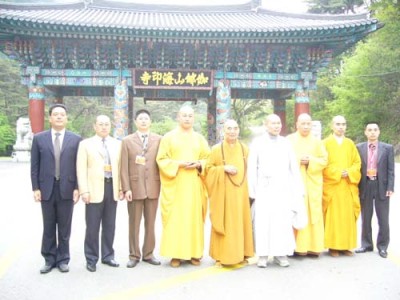 访问团成员及无义又学会主在伽耶山海印寺大门前合影