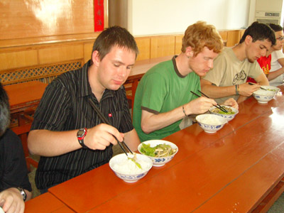 因为路上有所耽搁,十一点时学生们才到寺院。这些留学生年龄大约在二十岁左右,经过简单地交流,我了解到他们来自美国俄亥俄州武士特大学中文系,现在在西安外国语学院学习。此次来的目的是了解中国文化,正所谓“读万卷书,行万里路。”教务长转达了师父对他们的问候,并介绍了今天的活动安排,之后我带领他们到斋堂用斋,他们大多是第一次在寺院过堂,虽然听不懂法师们念诵的供养文,但他们还是非常认真地跟随着法师们一起做供养。吃饭时,很多人不习惯使用筷子,再加上饮食也不是很习惯,有几位学生在大众师父们吃完很长时间后还在吃饭,即便是这样,他们还是尽量不剩饭。