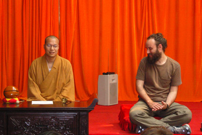 这些留学生们最感兴趣的是坐禅。从博物馆回来之后,大家安坐在法堂中,由佛学院副教务长简单教他们一些坐禅的方法。因为天气很热,再加上不能适应十二个小时的时差,他们都比较累,但法师讲的时候他们还是尽量认真的听。整个讲堂除了法师讲话之外没有任何声响。这样一些年轻人能够如此安静地听法师开示,实属难得。