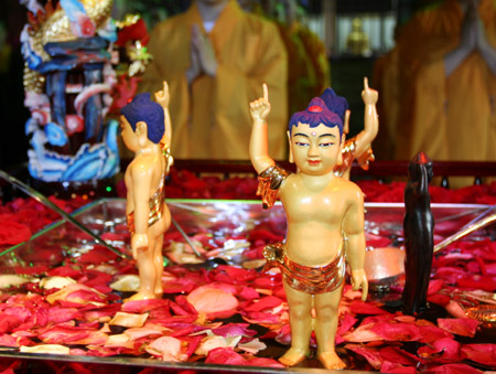 所以现在遇到佛诞时,各寺院都会以浴佛来庆祝这个伟大的日子。而其由来就是依九龙吐水沐金身,或四天王以天香汤浴太子身。其目的除了对这一代伟人表示欢迎敬仰之外,也借重这个机会希望所有的众生都能脱离尘垢,而且能像佛陀一样的得到清净的法身。如:我今灌沐诸如来,净智装严功德海;五浊众生离尘垢,仝证如来净法身。