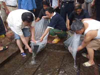 组织者徐少友告诉记者:“这次活动是由底蓬镇街道爱护环境的人士的自觉组织的,他们每人自愿捐资30元至50元,从外地购回“青波”、“锦鲫”等珍稀鱼苗品种,投放在长约7公里的绵溪河,以改善沿河的生态平衡。”今天分别在扎灯沱、李市坝等3个地方同时投放,每个投放点放鱼苗约1万多尾。