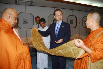 索比塔介绍了斯里兰卡佛教界的情况,表示两国佛教界的交往历史悠久,希望今后能继续增进双方的相互了解和友谊。叶大使表示,东晋时期中国高僧法显曾来斯研习佛法,这已成为两国人民世代传颂的佳话。中国政府鼓励和支持两国佛教界扩大交往,为增进两国人民友谊和巩固双边关系发挥更大作用。