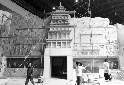 走进百花馆即将竣工的敦煌莫高窟展区,敦煌莫高窟标志性建筑“九层楼”气势不减,再往里走就是249号窟。