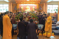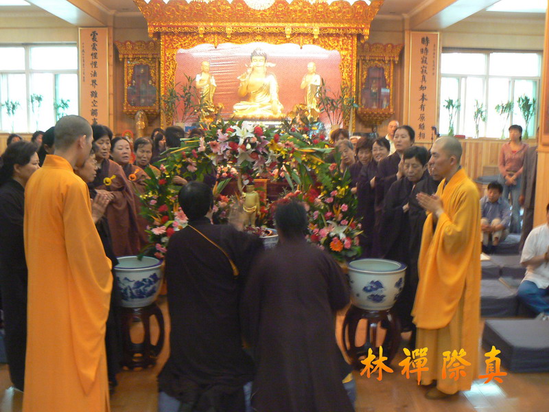 5月24日(四月初八)释迦牟尼佛圣诞日,举行了隆重的祝圣普佛和浴佛典礼。在佛殿和斋堂供设了两处浴佛坛场,在鲜花敷设的花环和花坛的簇拥下,释迦牟尼佛太子像在洒满玫瑰花瓣的香汤中栩栩如生。大众怀着虔诚恭敬的心情,沐浴佛像。从8时40分至11时,一千三百余位信众依次浴佛,法喜充满。