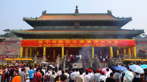 11日上午,第八届中国承德国际旅游文化节重头戏、具有浓厚的藏传佛教文化内涵的大型法会—“胜乐王佛灌顶”大法会在普宁寺大雄宝殿前隆重举办。