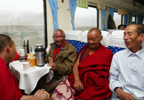 几位乘客乘坐N917次列车进藏朝佛(6月15日摄)。进入6月,西藏迎来旅游黄金季节,许多中外游客和藏传佛教信教群众乘坐青藏铁路列车进藏旅游、朝佛或探亲访友。目前,青藏铁路进藏列车上座率高,基本满员运行。