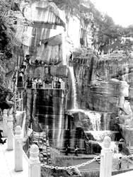 般若谷飞瀑 与浙江其他地方不同,新昌为山区,山水险峻又不失妩媚,有仙风道骨气韵,所以自古新昌的佛教发展繁盛,成为一方特色。到新昌作佛文化之旅,你会有许多收获。 新昌大佛寺为全国重点开放寺院,创建于东晋永和初,距今已有1600多年。寺周群山环抱,山崖壁立,奇岩突兀。而与之毗邻的千佛院,内有1075尊小石佛,有“越国敦煌”之称。近几年来,景区内相继开发了般若谷、佛心广场、木化石恐龙园、露天弥勒、罗汉洞、射雕村等特色景观。 大佛寺风景名胜区总面积25.5平方公里,由大佛寺、十里潜溪、南岩寺三部分组成,面积2.5平方公里,游览时间约3小时。 大佛寺内最著名的是依山开凿的弥勒石窟造像,通高16米,两膝相距10.6米,距今已有千年历史,是我国早期石窟造像在南方仅存的遗迹,被誉为“江南第一大佛”。六朝时期这里是佛教文化交流中心,高僧星聚,也是天台宗祖庭之一。历代有大批的文人墨客,如王羲之、李白、孟浩然、米芾、颜真卿、弘一法师、赵朴初、日本松浦友久教授等吟诗题联百余处。整个寺院的建筑依山就势、蜿蜒曲折、风格独特,是风景园林式寺院的典范,景区内山青谷翠,岩险石奇,池明如镜,修篁夹道,人工巧筑与天然野趣为一体。 十里潜溪以自然景观为主,环境优雅,涧流飞泻,怪石林立,有天烛湖、百丈岩、七盘仙谷等景点,玉兔岩、九龟上岸、狸猫听音、骆驼背猴等沿途景观,均是水石交战的矛盾统一体,让人叹为观止。 南岩寺创建于东晋永和年间,唐宋时僧众曾达八百,寺院邻近有任公子钓台、化云洞、玉女矶、蝙蝠洞等众多洞穴景观。世传中的“海迹神山”南岩寺正在修葺扩建中。 明月