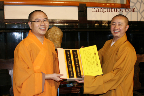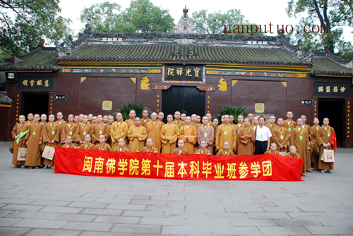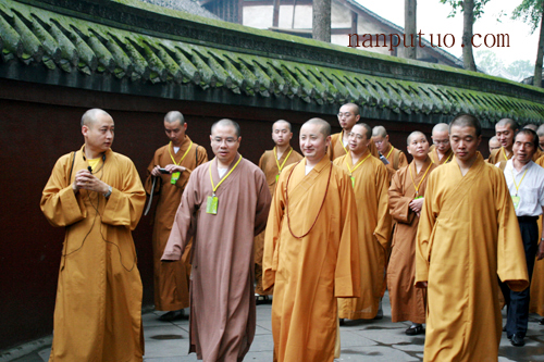 双方互赠了礼品之后,参学团参观了我国现存四大罗汉堂之一的宝光寺罗汉堂。堂中供奉五百七十七尊泥塑罗汉,塑像奇巧多姿,形象细腻。参学团在山门外合影留念,结束了对宝光寺的参访。