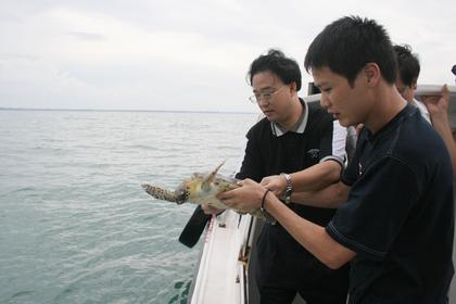 图为玳瑁被放归大海的情形。
