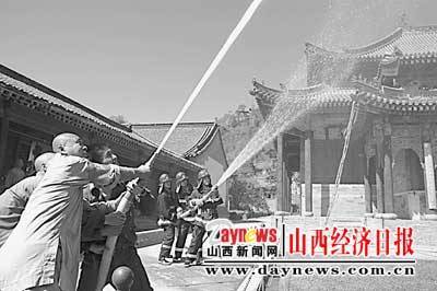佛教圣地五台山,寺庙云集,这里也是消防安全工作的重点。消防官兵指导僧人进行灭火演练。