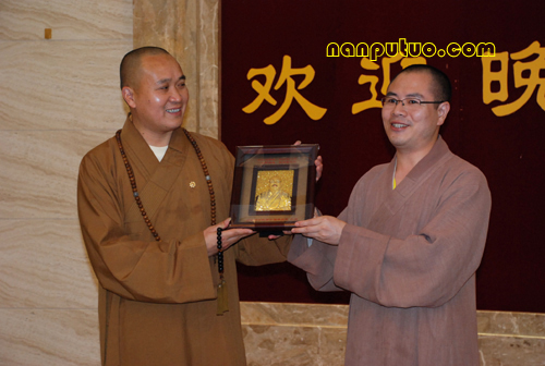 下午5:30分,峨眉山佛教协会会长、报国寺方丈永寿大和尚在峨眉山酒店宴请了参学团一行。界象法师向永寿大和尚能在百忙中抽空接待参学团表示了感谢。并向大和尚赠送了厦门漆线雕——太虚大师像和闽南特产铁观音,永寿大和尚也代表峨眉山佛协和报国寺向参学团赠送了蜀绣——普贤菩萨像和古版制本的峨眉山图志。