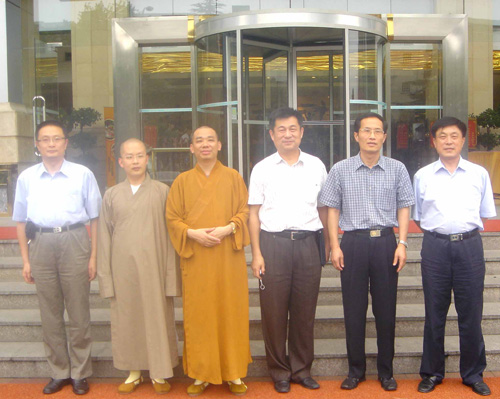 右二中国佛教协会陈文尧副秘书长、右四武昌佛学院副院长依正法师、右一湖北省佛教协会赵金桃秘书长、 右三湖北省民宗委宗教一处朱建昌处长、左一《法音》编辑部卢浔主任、左二中国佛学院教师正澄法师
