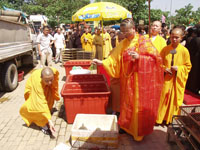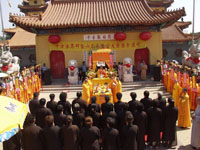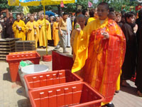 6月26日, 天津荐福观音寺水陆法会第四天举行大放生仪式,妙贤住持亲自主法为水族、飞禽授皈。此次放生共放飞麻雀鸟类2000只,泥鳅、鲤鱼、鲇鱼计20000条。大家以体现慈悲、期待平等之心虔诚诵念《放生仪轨》,随后将鱼儿放置天津东丽湖自由畅游、自乐其所。有近2000名信众随喜法会。