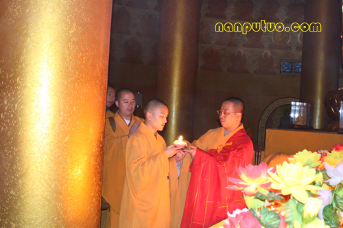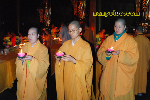 用过晚餐之后,在参学团团长界象法师,金顶当家师传法法师,参学团副团长达源法师的主持下,参学团全体学僧和金顶的常住法师及部分信众一起举行了“万盏明灯朝普贤”传灯法会。云雾缥缈间,盏盏心灯传递着佛陀的慈悲和大行普贤菩萨的智能愿力。梵呗绕梁,声声祈愿,表达了与会者对世界和平,社会和谐的诚挚愿望。