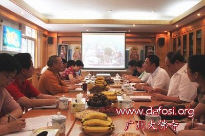随后,宾主一起来到大佛寺图书馆视听会议室展开座谈,耀智法师向各位领导汇报了近期拆迁工作的进展情况。