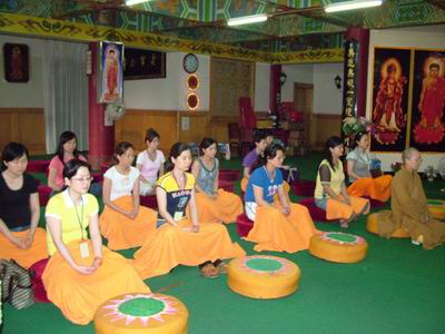 重庆佛教在线讯 据华岩寺报道 2007年6月16日下午2点,在华岩寺弘法楼念佛堂内,由来自泰国法身寺的觉旭法师主持此次禅修营的最后一个活动——坐禅。