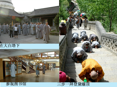 2007年5月26至29日,河北省佛学院师生一行69人行脚五台山。期间,师生一行朝拜了东台顶、菩萨顶、黛螺顶、圆照寺、显通寺、塔院寺、普寿寺、碧山寺、殊像寺、佛母洞、佛光寺和尊胜寺等多座寺院。师生们还参访了以道风精严著称的尼众道场普寿寺,亲近了94岁高龄的梦参法师。梦老语重心长地从修行和弘法两方面作了精湛的开示,使大家深受教育。