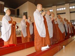 座谈会前,双方法师先到大殿面向如来,分别主客顶礼三拜,互表礼尚往来的敬意。全体韩国法师随后诵唱《三皈依》及《心经》,庄严的梵呗,刹那突破了语言上的隔阂,成为座谈会前别开生面的序幕。