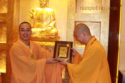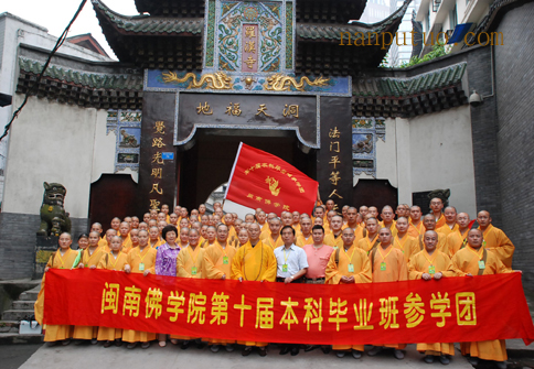 上午10:15分,我院参学团一行96人来到位于重庆市中心的千年古刹——罗汉寺。罗汉寺因塑有五百尊庄严古朴的罗汉像而闻名遐迩。其间的古迹、造像、人文、设施等都具有中国文化的传统规模和佛教特色。对于参学团的到来,罗汉寺上智下丰大和尚给予盛情接待。在大雄宝殿讽诵赞偈、参观完藏经楼之后。受重庆市佛教协会会长上惟下贤长老的委托,佛教协会副会长智丰大和尚及佛协办公室主任庞国婉女士、办公室秘书长张和平先生等领导设斋宴请参学团一行。席间,智丰大和尚说道:希望我院参学团的团员们能带着闽院特有的活跃思想学风走出校门,促进佛教的弘扬与发展,并祝大家参学之旅圆满如意。参学团副团长达源法师也代表参学团对他们的真诚欢迎表示衷心的感恩,并祝大和尚等人法体安康,法轮常转。随后双方互赠了礼品,午宴在愉快的气氛中结束。