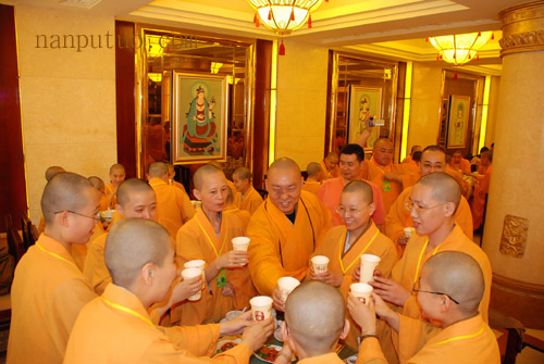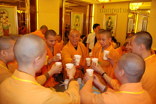 智丰大和尚与男众部学僧共同举杯表示友好欢迎