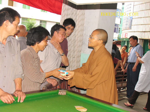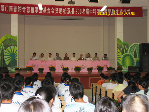 5月31日下午,受南普陀寺慈善会会长圣辉大和尚的委托,普陀、德鸣、天真三位法师及义诊院医师来到闽北松溪县助学和义诊施药。我会曾多次在松溪县赈灾救济、扶贫助学、义诊施药,得到了当地政府和百姓的一致赞誉。这次为该县资助200名特困生,每人400元,资助款8万元人民币;义诊村民300多人,施药金额5千多元。这次助学和义诊施药,给老区的学生带去了希望,为老区人民送去了幸福安康。