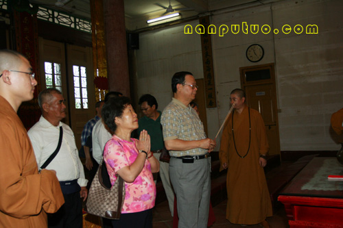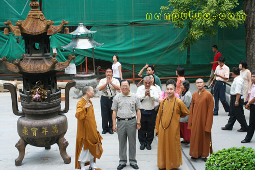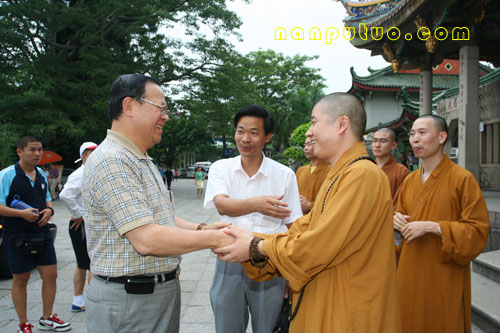 2007年6月24日下午4时45分,台湾知名人士、前法务部长、现任台湾台商服务总会会长廖正豪先生与部分爱好佛教的台湾人士一行二十余人来到南普陀寺参访,受到我寺方丈则悟大和尚,市民宗局一处苏人登处长及我寺知客德煌法师、明律法师,维那圆满法师等人的热情接待。