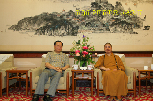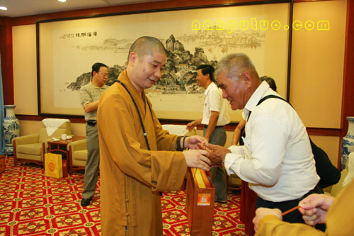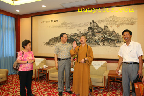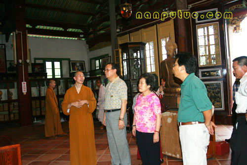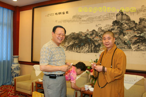 廖正豪先生一行在则悟大和尚等人的陪同下参观完南普陀寺的全貌后来到普照楼座谈。在和谐的气氛中宾主双方亲切的进行着交谈互动。廖正豪先生与则悟大和尚早在五、六年前即已相识,老友重逢话不休,当提起2002年佛指舍利赴台供奉这一佛界盛事时,廖先生赞许地为众人介绍到:当时,则悟大和尚任佛指舍利赴台供奉护法二团团长接受记者的采访,记者问到则悟大和尚用什么保护佛指舍利时,大和尚的回答是“用生命来保护佛指舍利”!此言一出,令众人赞叹不已,至今廖先生还记忆犹新,赞不绝口。则悟大和尚则表示,这是每一个出家人所应尽的责任与义务。