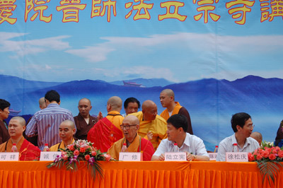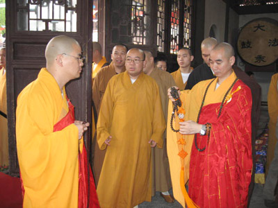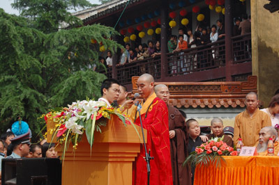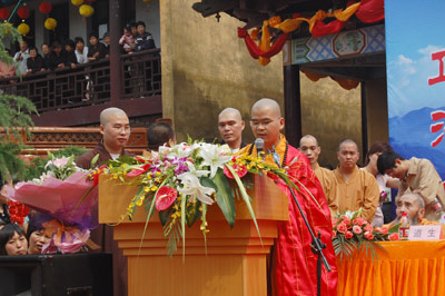 上午9点,诚信法师在大雄宝殿为宗立法师挂珠,广修长老在大殿给宗立法师送位,诚信法师代表宁波市佛教协会同仁讲话,祝贺宗立法师晋院成功,并勉励宗立法师,建设好丛林,引导信众树立正见,为和谐社会多做贡献。此外,宁波市宗教局陆立宪局长及慈溪市政府主要领导也出席法会并讲话。