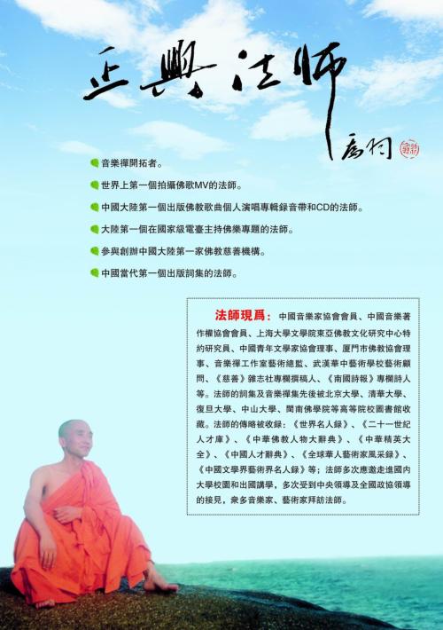 十年多前,為“修行”而出家的正興法師就開始了佛樂的探索,傳播佛教音樂,提出“音樂禪”課題,是音樂禪的實踐者;1994年,正興法師出版了第一張佛樂專輯《甘露》,是中國第一個出版佛歌盒帶和CD的法師。