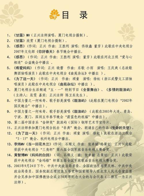十年來,正興法師堅持“修行第一,弘法第二”的原則,創作了很多面向大眾,充滿著一種關懷人生、與人為善、助人為樂的融哲理、禪意的歌曲,梵音妙音,清淨人間。