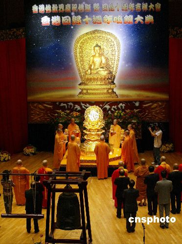 十年前这一夜,香港回归祖国;十年后的今夜,香港佛教界在位于尖沙咀的香港文化中心举行香港佛教史上最隆重的鸣钟大典,庆祝香港回归祖国十周年。
