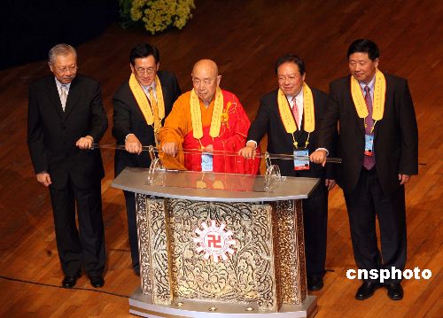 六月三十日晚,香港佛教界庆祝佛诞暨香港回归祖国十周年鸣钟大典在香港文化中心举行,香港佛教联合会会长觉光长老(中)及国家宗教局局长叶小文(右一)和特区政府官员共同主持亮灯仪式。