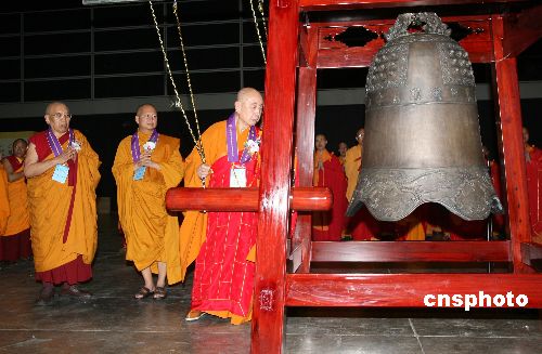 七月二日,香港佛教界在会展中心举行佛教南汉藏三大系联合庆祝香港回归十周年祝福大会,邀请佛教三大语系著名长老祝福加持香港市民如意吉祥、福慧增长。图为香港佛教联合会会长觉光长老等在祝福大会上鸣钟祝福。 六千香港市民出席了祝福大会。
