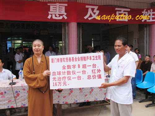 此次为上杭县庐丰乡卫生院捐赠红外线治疗仪、血球计数仪、B超各一台,价值15.2万元;为该乡村民施药5000元,义诊人数近 300名;为庐丰畲族中学200名中学生发放助学款6.58万元。厦门市委统战部副部长陈建德先生、市民宗局局长曾文瑛先生及市民宗局其他领导也参加了此次的爱心活动。