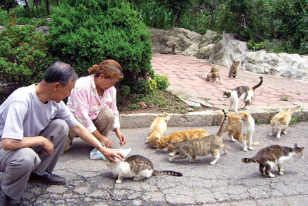 野猫们吃完了饭,都懒洋洋地仰躺在地上,宋大娘挨个叫着:“小白、小花、大胖、小胖,给客人打个滚儿。”这些小动物都懒洋洋地起来,听话地在地上打起滚来。宋大娘不住地摸着一只野猫背上的毛发,说:“这只已经养了10多年了,是老猫了。”