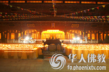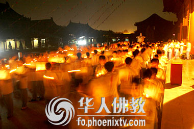 明海大和尚点燃第一盏莲灯,而后营员们按序从法师手中接过点燃的莲灯,几百名信众紧跟其后,灯灯相续,绵绵不断,手捧象征光明和智慧的莲花宝灯。在法师的带领下,缓缓行进,灯与灯相传,心与心相连,古佛道场,烛光闪烁,沉浸在一片金色琉璃中。