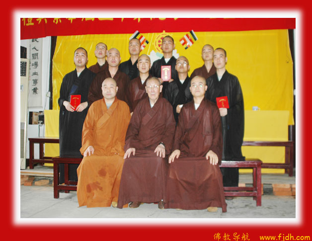 前排左起:弘法法师、明学法师、法隆法师与研究班学员合影留念
