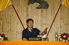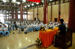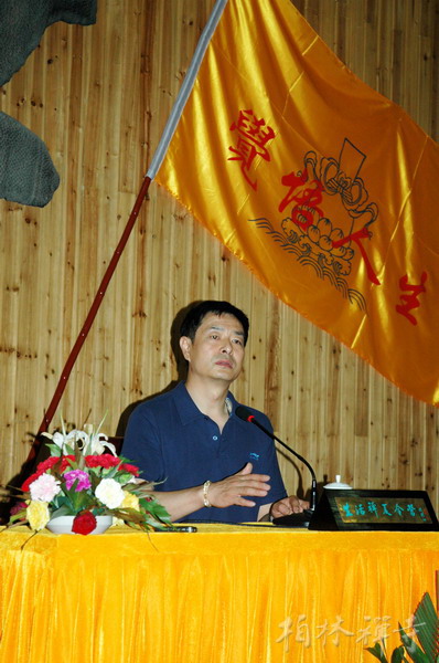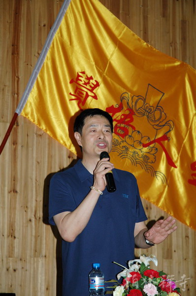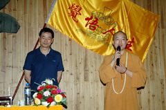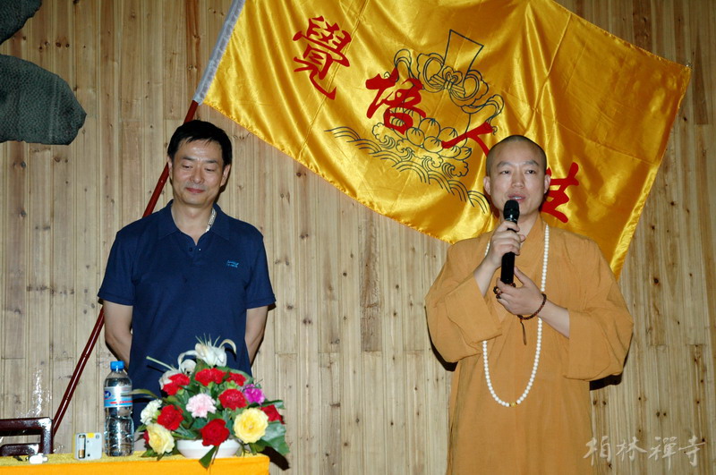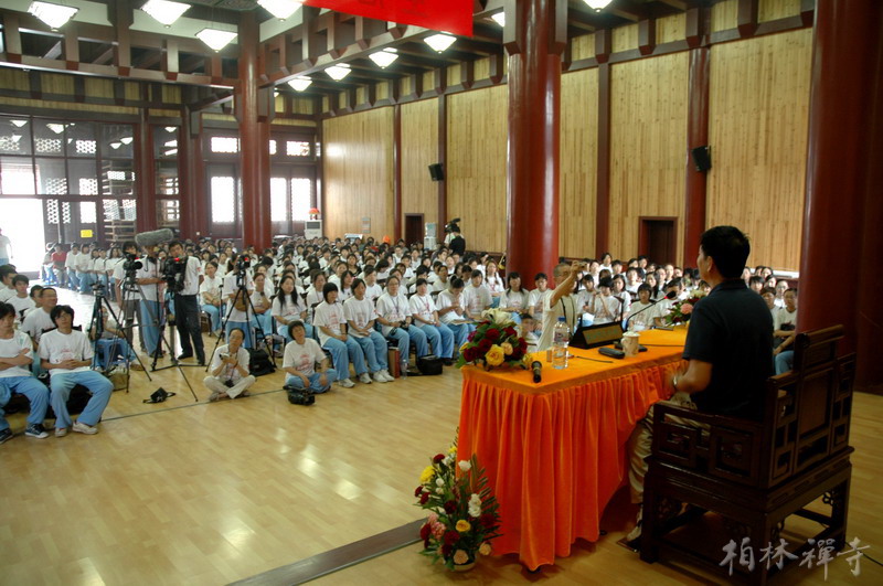 柏林禅寺网站报道:7月23日上午,在营员们嘹亮的《三宝歌》歌声中,著名演员濮存昕在明海法师的陪同下走上讲台,为400多名营员作了近两个小时的精彩演讲。