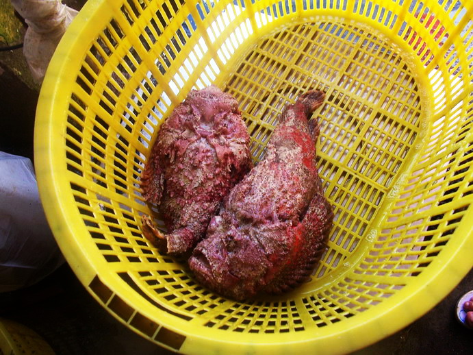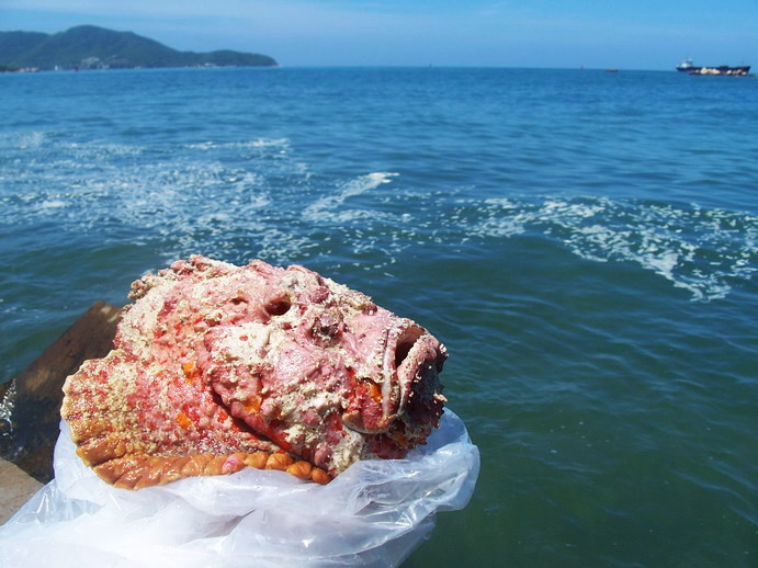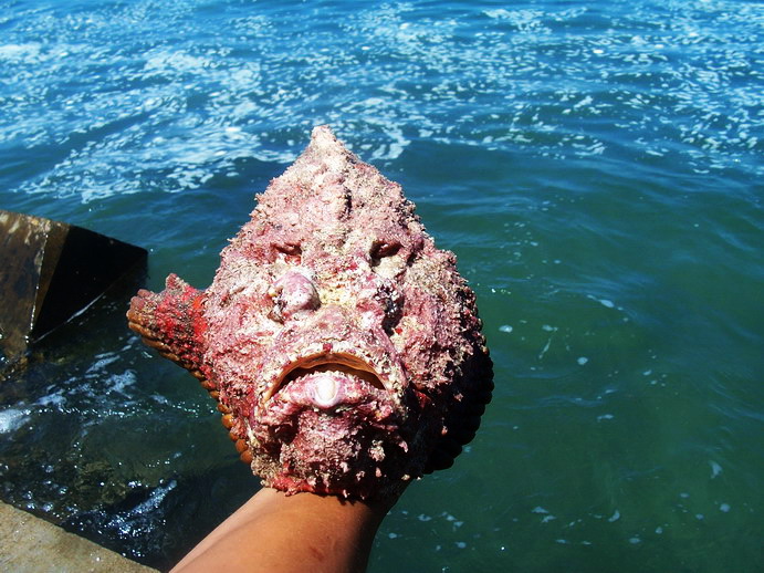 ----之后又购买两条石头鱼,我喜欢叫他老人头鱼,因为看他脸部的轮廓,活生生就好似一位闭目养神或者和膝下孙子辈斗气可爱老人!以前不知道此老人的厉害,经常直接用手去放生,或者抚摩和骚扰他的软肚皮。但被鱼老板严重警告,一旦被他身上的暗刺伤着,手会立即肿的象水桶,而且打两个月点滴也恢复不了,实在让人怕怕啊!