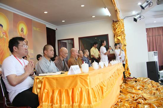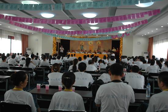 吃完早斋,休息片刻,所有营员和义工都进入会场坐好,到了八点半,所有贵宾和法师也都依次落座。