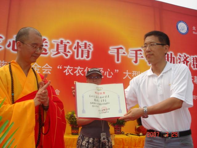 学诚法师代表仁爱基金会为捐赠单位颁发"捐赠证书",并为在市区内设立的捐赠点-- "仁爱心栈点"授牌。