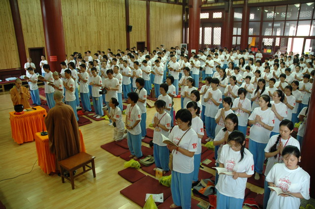彩旗飘飘,梵乐声声,古佛威严,高朋满座。2007年7月20日上午,柏林禅寺隆重举行了第十五届生活禅夏令营开营式。在悠扬的三宝歌中,净慧老和尚、明海大和尚、净因法师、素闻法师、明奘法师、国家宗教事务局一司刘威副司长、中共河北省委统战部刘青副部长、河北省民族宗教事务厅张兴堂副厅长、河北省政协民族宗教事务委员会陶家顺副主任、中共石家庄市委统战部哈宝福副部长、赵县人民政府张清华副县长,夏令营赞助人、护法夏泽红居士、李晓林居士、谢红居士,河北省、石家庄市、赵县的有关领导及河北省佛教协会的负责人,以及来自全国各地的三百余名营员等参加了开营式。与会的营员个个法喜充满,欢未曾有。