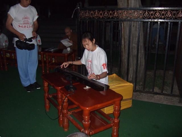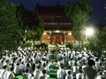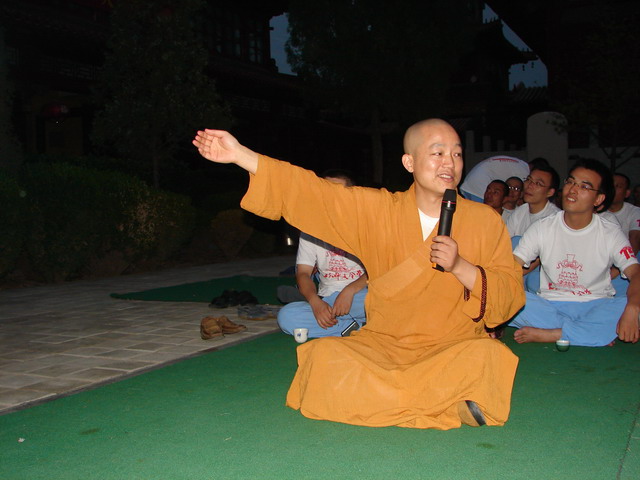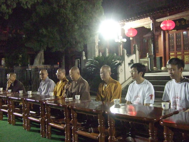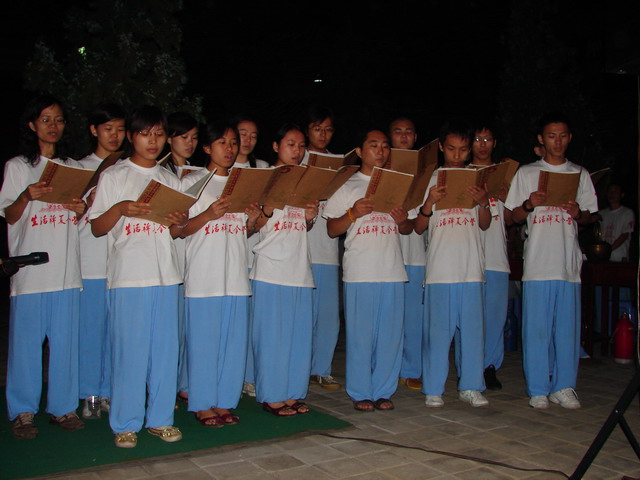 晚上,营员们和法师们一起在观音殿前普茶。明海大和尚通过一张张图片带领大家回顾了十四年来夏令营的点点滴滴,从最开始的简易工棚到如今的巍峨殿宇,营员们看到后都备受感动。此外,明奘法师、夏泽红居士、班文战居士等人也和大家一起分享了自己的夏令营经历。席间,真如缘起合唱小组为大家演唱了优美的佛乐,听着梵呗,品着禅茶,那颗尘俗之心想必早已放下了吧。最后,应营员邀请,净慧老和尚为大家做了开示。他指出,将信仰落实于生活,将修行落实于当下,将佛法融化于世间,将个人融化于大众是开悟的途径与法门。老和尚的开示令营员们更加深刻地理解了佛法、理解了生活禅。