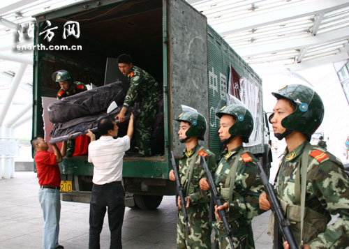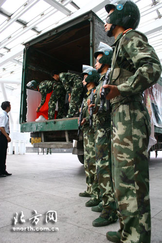 | 在天津武警官兵和公安干警的护送下,法门寺珍宝文物安全抵津 |