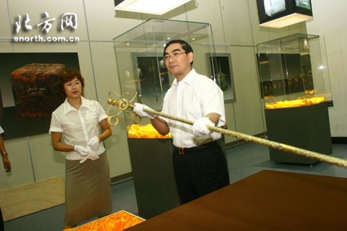 | 天津市文化局局长成其圣(右)从法门寺博物馆负责人手中接过“锡杖之王” |