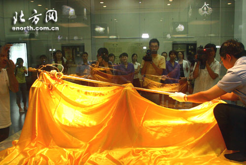 | 天津博物馆工作人员(右)正在小心安放国宝级文物鎏金迎真身银金花四轮十二环银锡杖 |