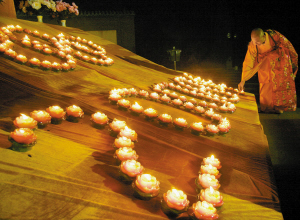 晚8时8分8秒,印乐一一点燃莲花烛(如图)。片刻,五环标志和“2008”的字样被点亮,盏盏红烛在夜色中发出明亮而柔和的光芒。随之,诵经之声响起。梵音伴着烛光,白马寺前一派祥和之气。
