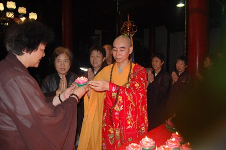 六日晚上,所有学员和法师齐聚法堂,举行了庄严而隆重的“传灯”法会。传灯法会由诚信法师点燃了第一盏蜡烛,依次的传到每一位法师和学员的手里,学员们和法师们一起,手捧红烛,默默的许愿,默默的祝福。法师和学员们手中接过的不仅仅是一盏红蜡烛,而是无上智慧和佛教文化的传播,一盏盏蜡烛不仅照亮了每个人的心田,也照亮了他们走向离苦得乐的菩提之路,他们将沿着这条光明之路,普写人生的和谐乐章。