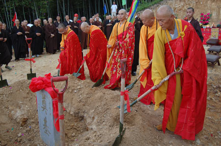 8月10日上午9时,天童禅寺总体规划项目中的千佛塔兴建工程奠基法会隆重举行。天童禅寺方丈诚信法师、滌瑕长老、修祥长老,利生长老、德云法师及两序大众,还有鄞州区旅游局、东吴镇政府及天童景区开发有限公司等领导参加法会。寺院方丈诚信法师为奠基法会主法并作重要讲话。